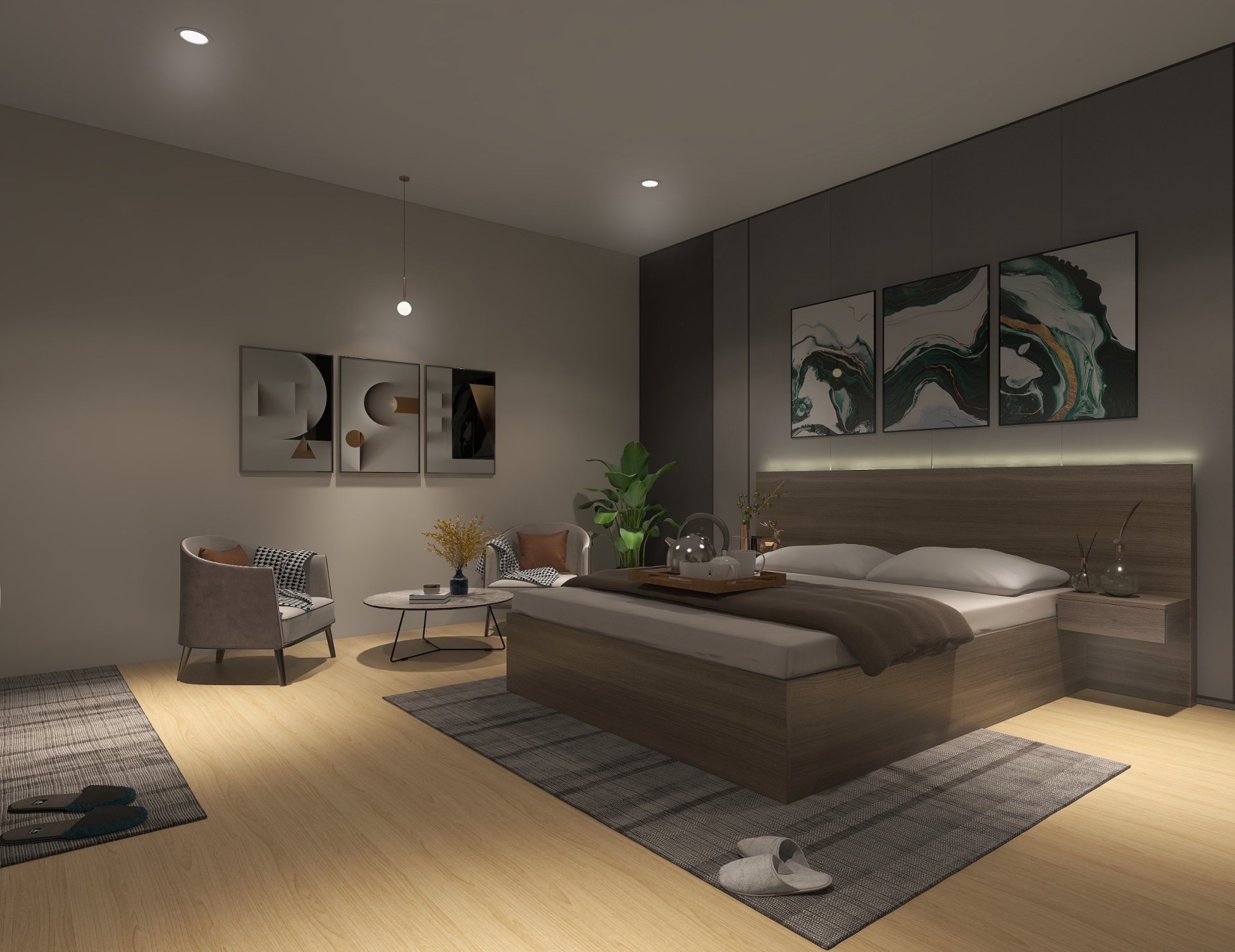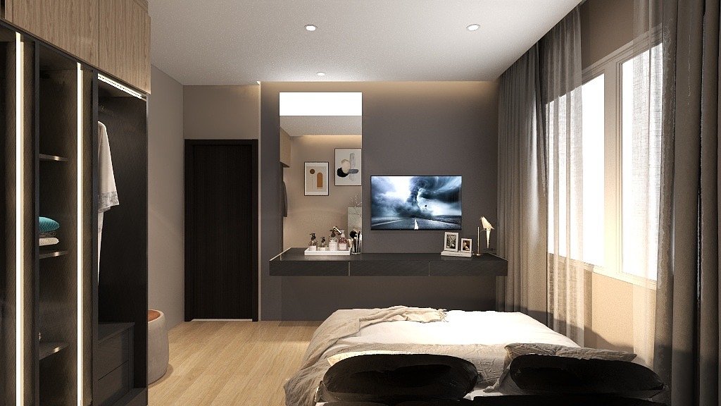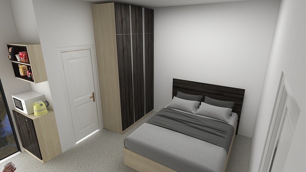 งานออกแบบเฟอร์นิเจอร์บิ้วอิน สำหรับ 1 ห้อง ในโครงการห้องพัก ประกอบไปด้วย ชั้นวางทีวี ตู้เสื้อผ้า ชุดเคาท์เตอร์ครัว ตู้แขวนเก็บของ ตู้ใส่ของและที่สำหรับนั่งรับประทานอาหาร รวมไปถึงเตียง
