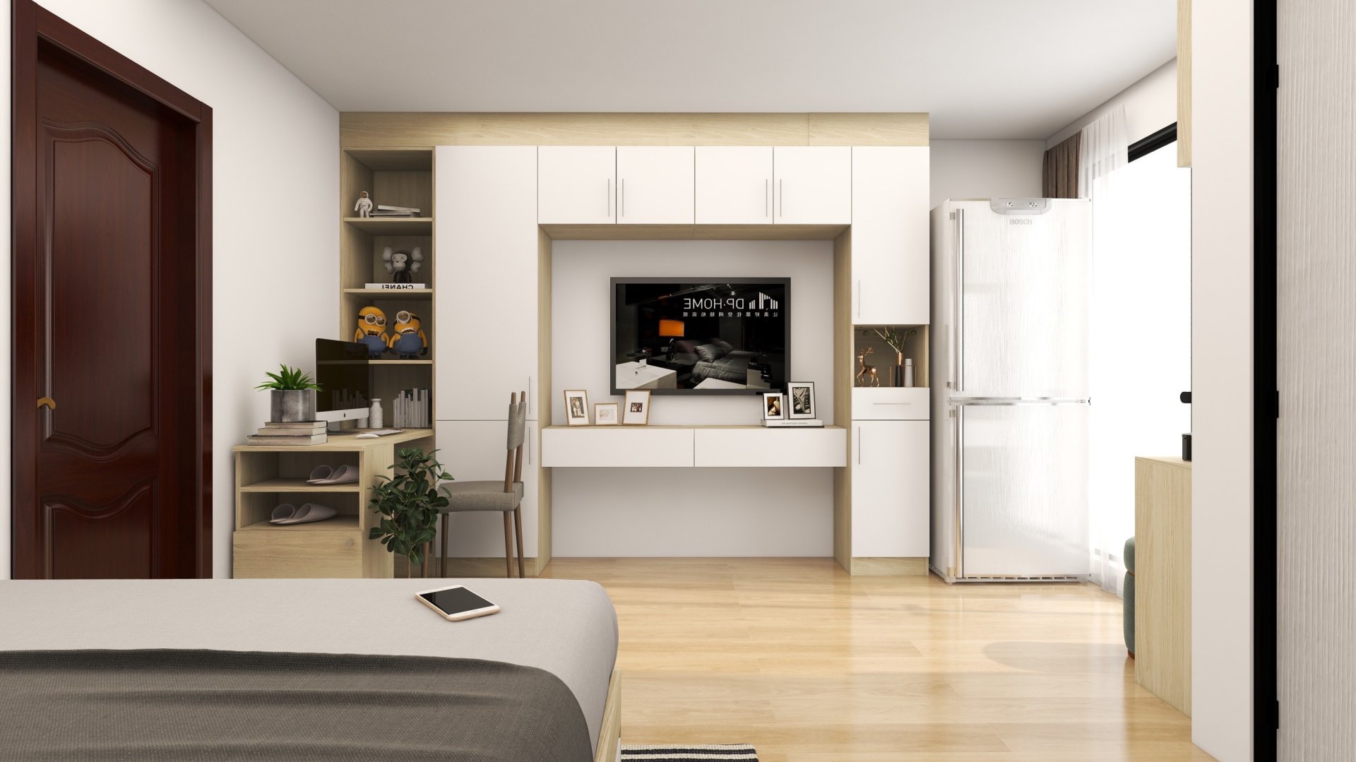 เตียงนอน โต๊ะทำงาน และ ตู้เสื้อผ้า