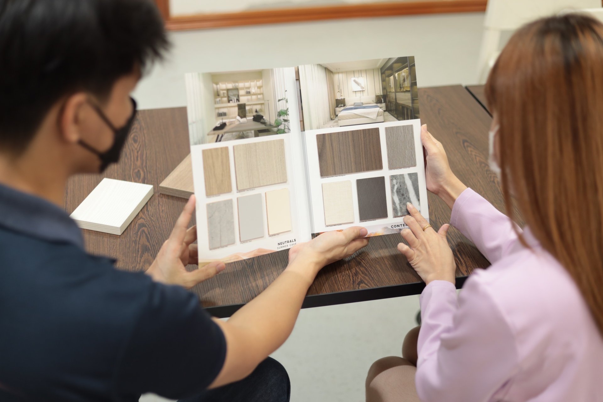 หลังจากได้ขนาดพื้นที่ห้อง และรับได้ทราบถึงความต้องการของลูกค้าแล้ว ก็มาถึงขบวนการเลือก ฟังก์ชั่นการใช้ (หน้าบาน จำนวนชั้น) อุปกรณ์ฟิตติ้งต่างๆ และ สี โดยวัสดุที่นำมาใช้ จะเป็น ไม้ปาติเกิ้ลเคลือบเมลามีน เกรดกันชื้น E1 (European Standard Class 1) ซึ่งกำหนดให้มีสารฟอร์มาดิไฮด์เพียงแค่ 0.008 เท่านั้น และผ่านการทดสอบ V313 จึงปลอดภัย ไม่มีกลิ่นฉุน ไม่แสบตา ได้รับมาตรฐาน ญี่ปุ่น และ ยุโรป ในขั้นตอนนี้ นักออกแบบจะวัดหน้างานจริงอย่างละเอียด ระยะประตู ขอบหน้าต่าง รายละเอียดต่างๆจะถูกนำมาใส่ในแพลนงานเพื่อให้งานออกมาสมจริงมากที่สุด ในระหว่างนี้นักออกแบบจะลงรายละเอียดฟังก์ชั่นการใช้งาน อาทิเช่น รางลิ้นชัก จำนวนชั้นวาง บานเปิด หรือ บานปิด การเลือกมือจับ รวมไปถึง สีที่ผู้ใช้ชอบและอยากได้